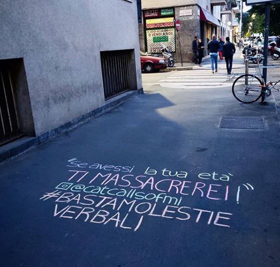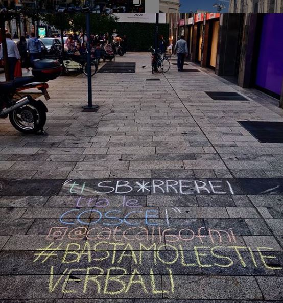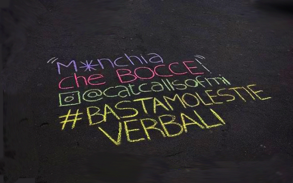 L’impatto visivo è forte: i gessetti colorati rimandano a un immaginario legato all’infanzia e ai giochi dei bambini, mentre quello che si legge è volgare, aggressivo e violento. Una bella rappresentazione dello shock che vivono le ragazzine al primo contatto con il catcalling.